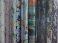 产品特点介绍透明 采用低毒PVC透明材料,铺以精美的柯式印刷的透明定位桌巾,图案逼真,鲜活灵动,赏心悦目,最适合搭配各类高档原色家私。给您的居室增添高雅和晶莹剔透的美感,更可根据您的喜好和居室的态度,挑选您喜欢的花色和款式,自然和谐的搭配。同时推出卷装透明印花的台布,它除了具有上述台布的优点外,更具备可依据不同家私的尺寸和不同季节,随心所欲的裁剪自己喜好的大小,彰显您的个性。卷庄 采用低毒PVC材料或PEVA环保材料,辅以精美的印刷,背面可搭配具有不同特性的多种材料。a针扎棉:具有隔热、柔软的本